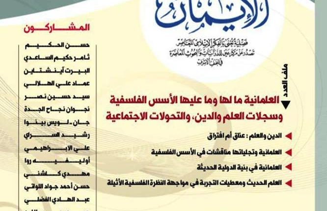 1- مجلة الإيمان : فصلية تعنى بالفكر الإسلامي المعاصر، ملف العدد (2-3): نقد العلمانية، وموضوعات متنوعة أخرى.