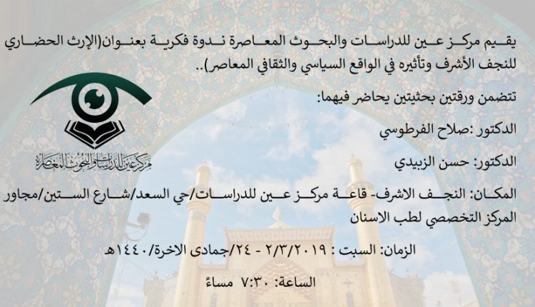 يقيم مركز عين للدراسات والبحوث المعاصرة ندوة فكرية بعنوان(الإرث الحضاري للنجف الأشرف وتأثيره في الواقع السياسي والثقافي المعاصر)..
